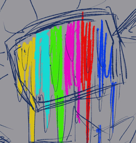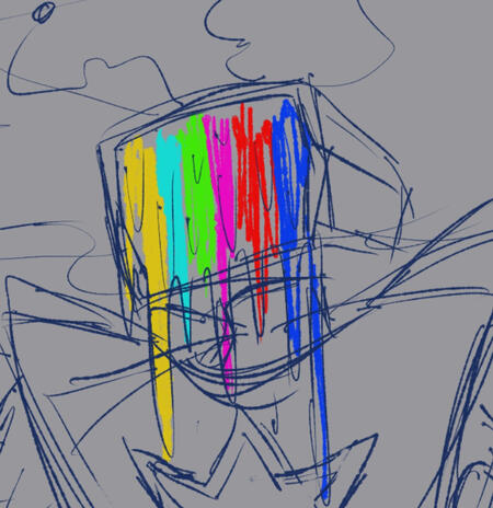 Notable design elements:- his screen is notably broken with the colour bar colours spilling out everywhere as a watery liquid