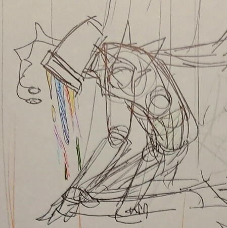 - where his top pair of arms and torso attatch, there are light rays, directly referencing tenna's sprite when he gets cleaved by the roaring knight